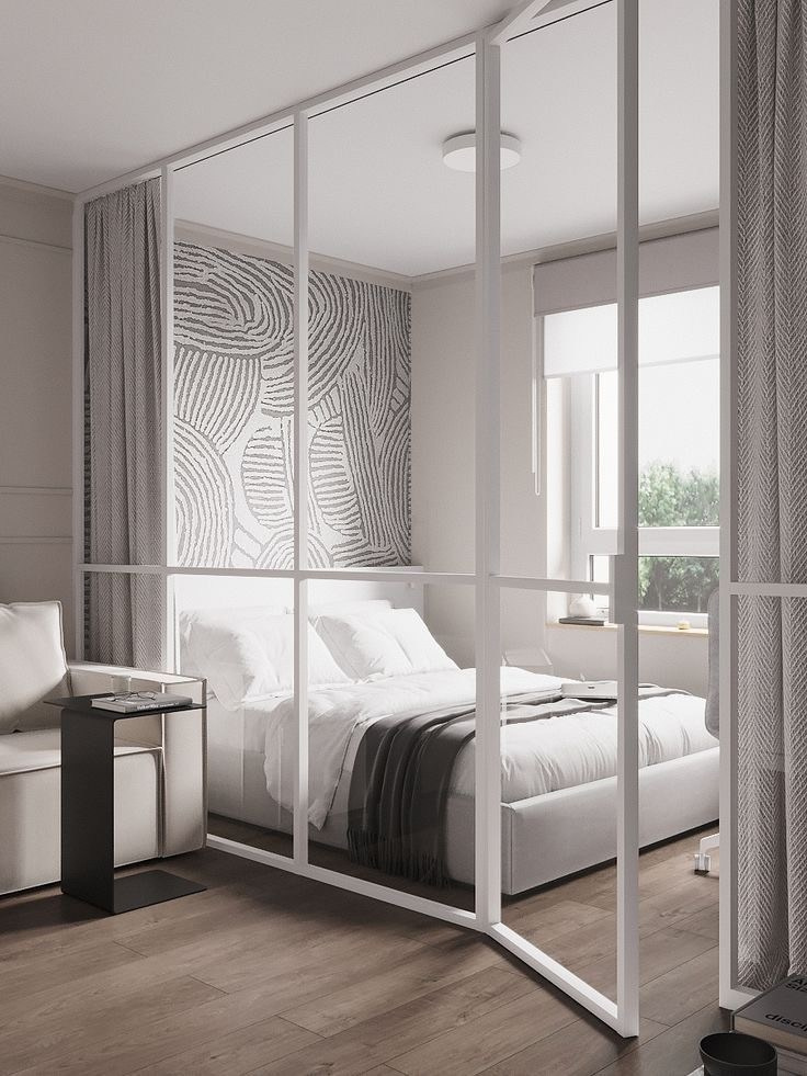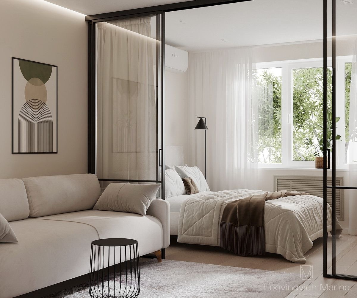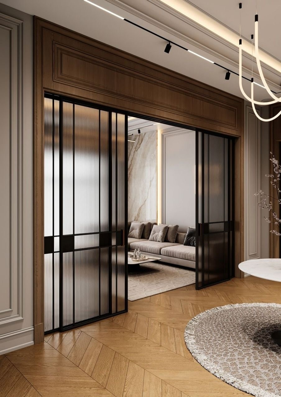 Раздвижные перегородки — это отличный вариант для тех, кто хочет зонировать пространство без необходимости полностью закрывать помещение. Они работают по принципу дверей-купе, легко перемещаясь по направляющим. Это позволяет менять конфигурацию комнаты за считанные секунды.