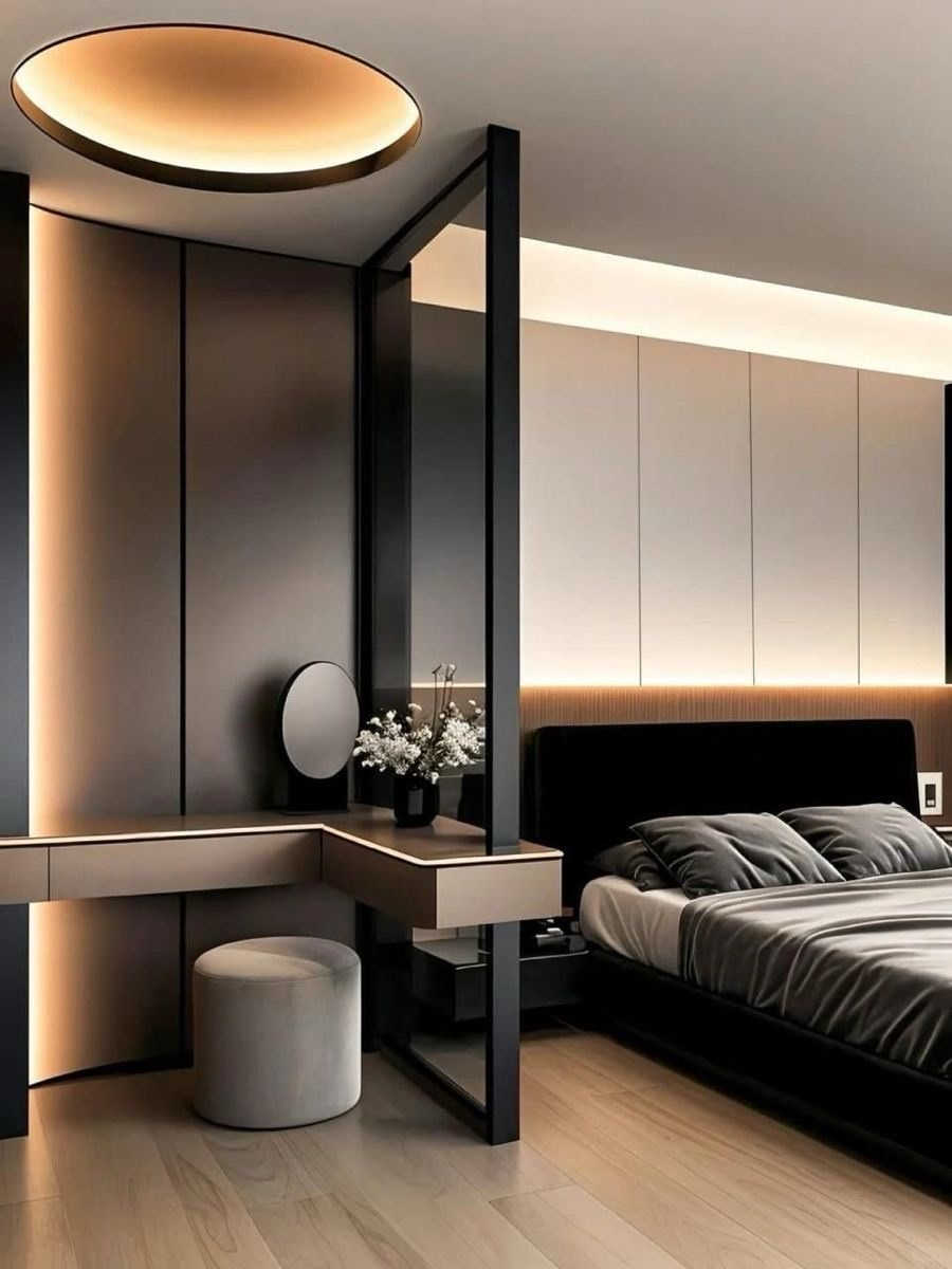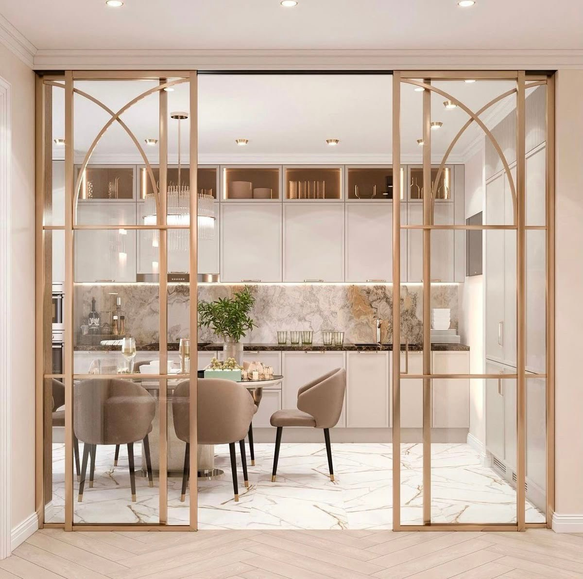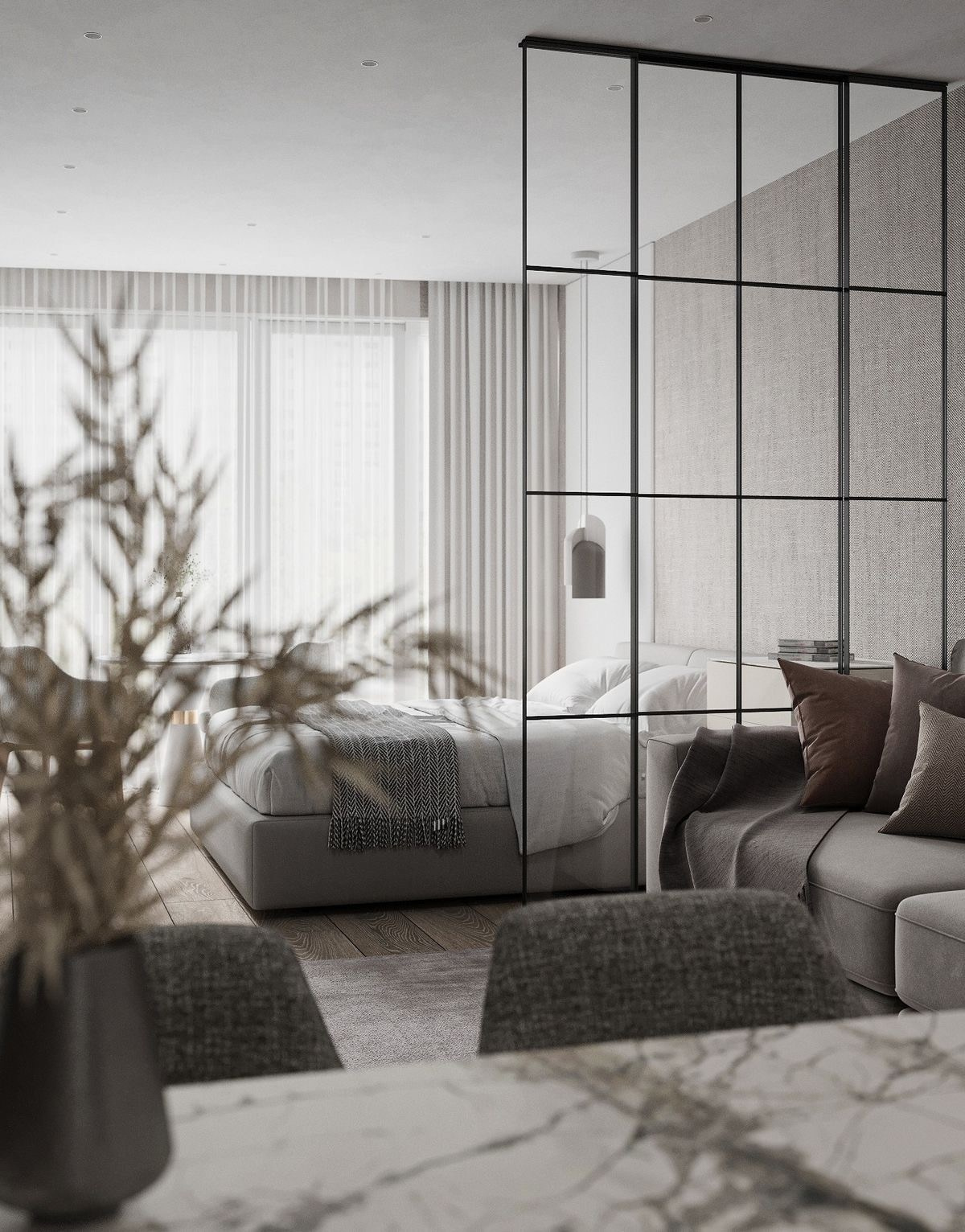 Раздвижные перегородки — это отличный вариант для тех, кто хочет зонировать пространство без необходимости полностью закрывать помещение. Они работают по принципу дверей-купе, легко перемещаясь по направляющим. Это позволяет менять конфигурацию комнаты за считанные секунды.